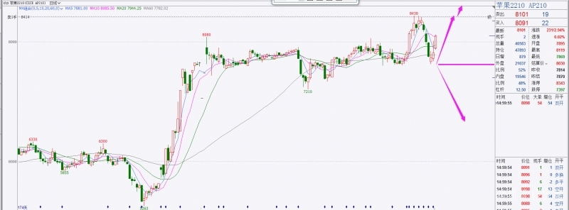 苹果10如果持仓比较大,持续站稳8000,技术上就要看多了,如果基本面和资金配合,很可能疯狂拉涨,上升想象空间很大。拉不上去,也有资金会进来砸盘,目前方向不明。所以建议散户暂时别动手,观望等方向,先让机构烧点钱,点把火。