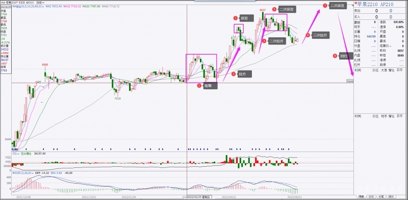 很多散户以为主力都是菜鸟,其实大错特错,机构资金体量较大,每一次的动作没有十有八九的胜算,一般是不会出手的。作为散户,一定要有主力思维,尽量摒弃散户思维。苹果的主力不像其他品种那么复杂,就是一两支私募资金在里面控盘。到目前为止,私募资金的主要方向还是做多的,这个从盘面上可以看出来。苹果2110合约主力建仓的吸筹的时间大概在2月底到3月底,位置是7600-7800附近,第一次派发点位在9000-9200附近,第二次吸筹加仓是4月底,点位在8400-8600附近,5连阳以后,快速派发,在5月5日以后逐步出货,点位都在9200以上。从盘面上预计,2210合约还有一次反弹拉升,预计拉升区间在8800-9800,具体高点未知,要看多头的实力和空头的打压程度。苹果10合约炒作完毕以后,在没有增量资金入场的前提下,持仓降低到3-5万时,最后应该会回归到主力拉涨前的点位附近。当然,后期还要看多空双方的博弈,后期方向还需要进一步结合基本面和市场情绪决定,不能盲目判断。